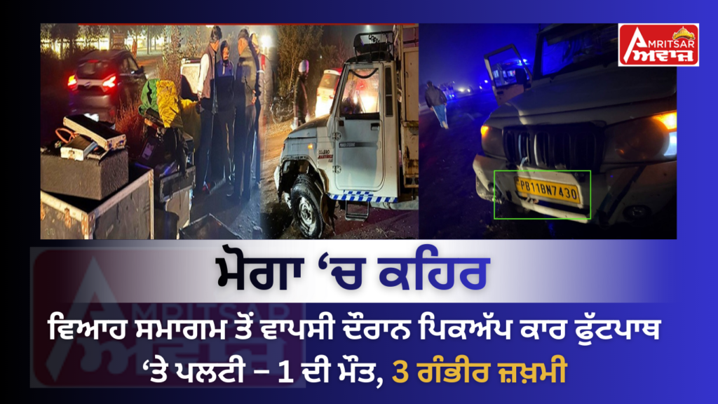 ਮੋਗਾ : ਵਿਆਹ ਸਮਾਗਮ ਤੋਂ ਵਾਪਿਸ ਆ ਰਹੀ ਪਿਕਅੱਪ ਗੱਡੀ ਫੁੱਟਪਾਥ ‘ਤੇ ਪਲਟੀ, 1 ਦੀ ਮੌਤ, 3 ਜ਼ਖਮੀ