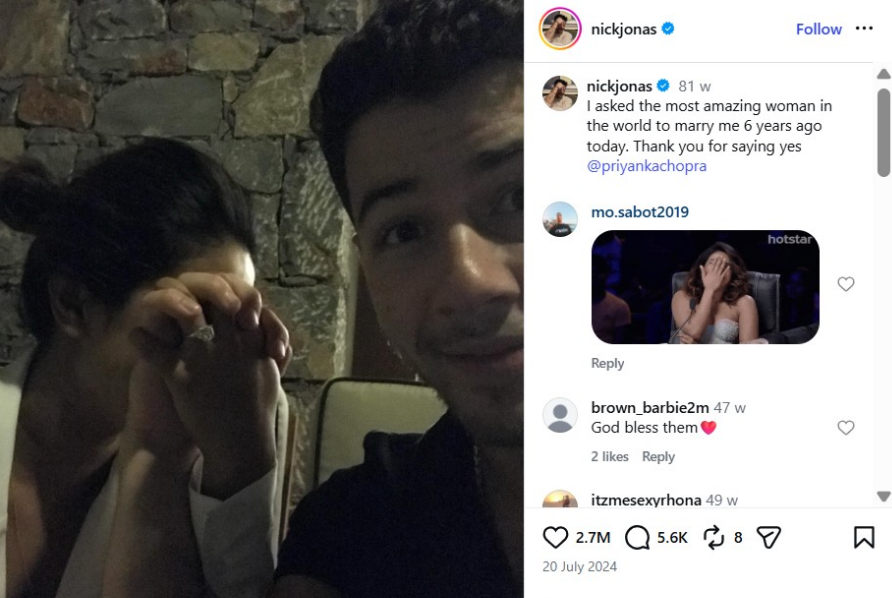 ਪ੍ਰਿਅੰਕਾ ਇਹ ਸੁਣ ਕੇ ਇੰਨੀ ਹੈਰਾਨ ਰਹਿ ਗਈ ਕਿ ਉਸ ਨੂੰ ਜਵਾਬ ਦੇਣ ਵਿੱਚ 45 ਸੈਕਿੰਡ ਲੱਗ ਗਏ। ਇਸ ਦੌਰਾਨ ਨਿਕ ਨੇ ਕਿਹਾ, “ਮੈਂ ਹੁਣ ਇਹ ਅੰਗੂਠੀ ਤੇਰੀ ਉਂਗਲ ਵਿੱਚ ਪਾਉਣ ਜਾ ਰਿਹਾ ਹਾਂ, ਜੇ ਤੈਨੂੰ ਕੋਈ ਇਤਰਾਜ਼ ਨਾ ਹੋਵੇ।”