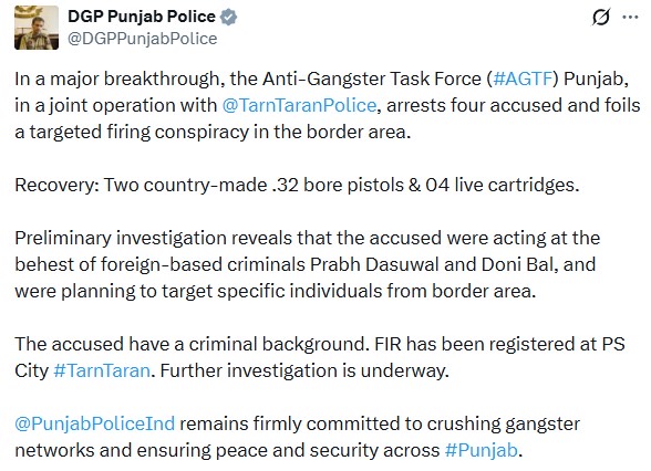 ਡੀਜੀਪੀ ਨੇ ਜਾਣਕਾਰੀ ਦਿੰਦਿਆਂ ਦੱਸਿਆ ਕਿ ਇੱਕ ਵੱਡੀ ਸਫਲਤਾ ਪ੍ਰਾਪਤ ਕਰਦੇ ਹੋਏ, ਐਂਟੀ-ਗੈਂਗਸਟਰ ਟਾਸਕ ਫੋਰਸ (AGTF) ਪੰਜਾਬ ਵੱਲੋਂ ਤਰਨਤਾਰਨ ਪੁਲਿਸ ਨਾਲ ਸਾਂਝੇ ਆਪ੍ਰੇਸ਼ਨ ਵਿੱਚ, ਚਾਰ ਮੁਲਜ਼ਮਾਂ ਨੂੰ ਗ੍ਰਿਫਤਾਰ ਕਰਕੇ ਸਰਹੱਦੀ ਇਲਾਕੇ ਵਿੱਚ ਨਿਸ਼ਾਨਾ ਬਣਾਕੇ ਫਾਇਰਿੰਗ ਦੀ ਸਾਜਿਸ਼ ਨਾਕਾਮ ਕਰ ਦਿੱਤੀ ਹੈ। ਮੁਲਜ਼ਮਾਂ ਕੋਲੋਂ ਦੋ ਦੇਸੀ ਪਿਸਤੌਲ .32 ਬੋਰ ਅਤੇ 04 ਜ਼ਿੰਦਾ ਕਾਰਤੂਸ ਬਰਾਮਦ ਹੋਏ ਹਨ।