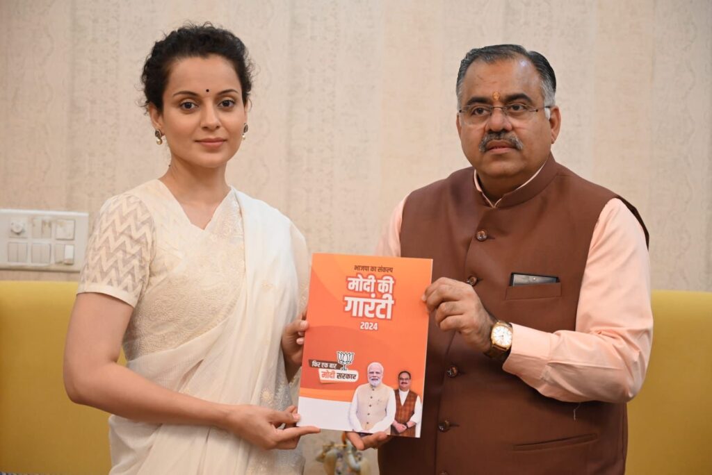 ਬਾਲੀਵੁੱਡ ਅਭਿਨੇਤਰੀ ਕੰਗਨਾ ਰਣੌਤ ਨੇ ਦਿੱਲੀ ਸਥਿਤ ਭਾਜਪਾ ਦੇ ਜਨਰਲ ਸਕੱਤਰ ਤਰੁਣ ਚੁੱਘ ਨਾਲ ਉਨ੍ਹਾਂ ਦੇ ਘਰ ਸ਼ਿਸ਼ਟਾਚਾਰ ਕੀਤਾ।ਮੀਡੀਆ ਵਿੱਚ ਇੱਕ ਬਿਆਨ ਜਾਰੀ ਕਰਦਿਆਂ ਭਾਜਪਾ ਦੇ ਕੌਮੀ ਜਨਰਲ ਸਕੱਤਰ ਤਰੁਣ ਚੁੱਘ ਨੇ ਕਿਹਾ ਕਿ ਬਾਲੀਵੁੱਡ ਅਦਾਕਾਰਾ ਅਤੇ ਮੰਡੀ ਤੋਂ ਲੋਕ ਸਭਾ ਉਮੀਦਵਾਰ ਕੰਗਨਾ ਰਣੌਤ ਇੱਕ ਬਹੁਤ ਹੀ ਪ੍ਰਤਿਭਾਸ਼ਾਲੀ ਕਲਾਕਾਰ ਹੈ ਅਤੇ ਰਾਸ਼ਟਰਵਾਦੀ ਸੋਚ ਨਾਲ ਭਰਪੂਰ ਹੈ।ਚੁੱਘ ਨੇ ਕਿਹਾ ਕਿ ਉਨ੍ਹਾਂ ਨੇ ਕਈ ਸਮਾਜਿਕ-ਰਾਜਨੀਤਿਕ ਮੁੱਦਿਆਂ ‘ਤੇ ਕੰਗਨਾ ਰਣੌਤ ਨਾਲ ਉਸਾਰੂ ਚਰਚਾ ਕੀਤੀ ਹੈ। ਅਤੇ ਹਿਮਾਚਲ ਪ੍ਰਦੇਸ਼ ਦੇ ਮੰਡੀ ਲੋਕ ਸਭਾ ਹਲਕੇ ਵਿੱਚ ਅਗਾਊਂ ਜਿੱਤ ਲਈ ਸ਼ੁਭ ਕਾਮਨਾਵਾਂ ਦਿੱਤੀਆਂ।ਸ਼੍ਰੀ ਚੁੱਘ ਨੇ ਪ੍ਰਧਾਨ ਮੰਤਰੀ ਨਰਿੰਦਰ ਮੋਦੀ ਦੀ ਅਗਵਾਈ ਵਾਲੀ ਕੇਂਦਰ ਸਰਕਾਰ ਦੀਆਂ ਸ਼ਾਨਦਾਰ ਪ੍ਰਾਪਤੀਆਂ ਬਾਰੇ ਚਰਚਾ ਕੀਤੀ। ਵਿਸ਼ੇਸ਼ ਤੌਰ ‘ਤੇ ਮੋਦੀ ਸਰਕਾਰ ਵੱਲੋਂ ਔਰਤਾਂ ਦੇ ਖੇਤਰ ਵਿੱਚ ਕੀਤੇ ਗਏ ਕੰਮ, ਨਾਰੀ ਸ਼ਕਤੀ ਵੰਦਨ, ਸਵੈ-ਨਿਰਭਰਤਾ ਅਤੇ ਮਹਿਲਾ ਸਸ਼ਕਤੀਕਰਨ ਅਤੇ ਵਿਕਸਿਤ ਭਾਰਤ ਦੇ ਮਿਸ਼ਨ ਵਿੱਚ ਔਰਤਾਂ ਸਮਾਜਿਕ, ਰਾਜਨੀਤਿਕ ਅਤੇ ਆਰਥਿਕ ਤੌਰ ‘ਤੇ ਸਕਾਰਾਤਮਕ ਯੋਗਦਾਨ ਕਿਵੇਂ ਪਾ ਸਕਦੀਆਂ ਹਨ, ਇਸ ਬਾਰੇ ਵੀ ਚਰਚਾ ਕੀਤੀ ਗਈ ਅਤੇ ਕਿਹਾ ਗਿਆ ਕਿ ਇਸ ਦੇ ਤਹਿਤ। ਮਾਣਯੋਗ ਪ੍ਰਧਾਨ ਮੰਤਰੀ ਸ਼੍ਰੀ ਨਰੇਂਦਰ ਮੋਦੀ ਦੀ ਅਗਵਾਈ ਵਿੱਚ, ਭਾਜਪਾ ਦਾ ਦੇਸ਼ ਦੀ ਸੇਵਾ ਦਾ ਕੰਮ ਸਬਕਾ ਸਾਥ ਸਬਕਾ ਵਿਕਾਸ ਅਤੇ ਸੇਵਾ, ਸੁਸ਼ਾਸਨ ਅਤੇ ਗਰੀਬ ਕਲਿਆਣ ਦੇ ਮੂਲ ਮੰਤਰ ਨਾਲ ਜਾਰੀ ਰਹੇਗਾ।