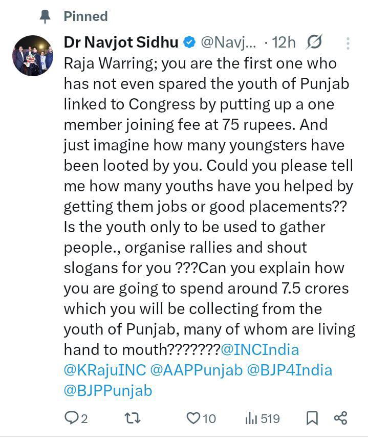 ਨਵਜੋਤ ਕੌਰ ਸਿੱਧੂ ਨੇ ਦੂਜੇ ਟਵੀਟ ‘ਚ ਕਿਹਾ ਹੈ ਕਿ ‘ਤੁਸੀਂ (ਰਾਜਾ ਵੜਿੰਗ) ਪਹਿਲੇ ਅਜਿਹੇ ਵਿਅਕਤੀ ਹੋ ,ਜਿਸ ਨੇ ਕਾਂਗਰਸ ਨਾਲ ਜੁੜੇ ਪੰਜਾਬ ਦੇ ਨੌਜਵਾਨਾਂ ਨੂੰ ਵੀ ਨਹੀਂ ਬਖਸ਼ਿਆ, ਇੱਕ ਮੈਂਬਰ ਦੀ ਜੁਆਇਨਿੰਗ ਫੀਸ 75 ਰੁਪਏ ਰੱਖੀ ਹੈ। ਜ਼ਰਾ ਸੋਚੋ ਕਿ ਤੁਸੀਂ ਕਿੰਨੇ ਨੌਜਵਾਨਾਂ ਨੂੰ ਲੁੱਟਿਆ ਹੈ। ਕੀ ਤੁਸੀਂ ਮੈਨੂੰ ਦੱਸ ਸਕਦੇ ਹੋ ਕਿ ਤੁਸੀਂ ਕਿੰਨੇ ਨੌਜਵਾਨਾਂ ਨੂੰ ਨੌਕਰੀਆਂ ਜਾਂ ਚੰਗੀ ਪਲੇਸਮੈਂਟ ਦਿਵਾ ਕੇ ਉਨ੍ਹਾਂ ਦੀ ਮਦਦ ਕੀਤੀ ਹੈ? ਕੀ ਨੌਜਵਾਨਾਂ ਦਾ ਇਸਤੇਮਾਲ ਸਿਰਫ਼ ਲੋਕਾਂ ਨੂੰ ਇਕੱਠਾ ਕਰਨ, ਰੈਲੀਆਂ ਕਰਨ ਅਤੇ ਆਪਣੇ ਲਈ ਨਾਅਰੇ ਲਗਾਉਣ ਲਈ ਕੀਤਾ ਜਾਂਦਾ ਹੈ? ਕੀ ਤੁਸੀਂ ਦੱਸ ਸਕਦੇ ਹੋ ਕਿ ਪੰਜਾਬ ਦੇ ਨੌਜਵਾਨਾਂ ਤੋਂ ਇਕੱਠੇ ਕੀਤੇ ਜਾਣ ਵਾਲੇ 7.5 ਕਰੋੜ ਰੁਪਏ ਕਿਵੇਂ ਖਰਚ ਕਰਨ ਵਾਲੇ ਹੋ ?
