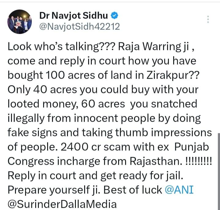 ਨਵਜੋਤ ਕੌਰ ਸਿੱਧੂ ਨੇ ਟਵੀਟ ਕਰਦਿਆਂ ਜ਼ੀਰਕਪੁਰ ‘ਚ ਜ਼ਮੀਨ ਖਰੀਦਣ ਸਬੰਧੀ ਰਾਜਾ ਵੜਿੰਗ ਤੋਂ ਸਵਾਲ ਪੁੱਛੇ ਹਨ। ਨਵਜੋਤ ਕੌਰ ਸਿੱਧੂ ਨੇ ਕਿਹਾ ਕਿ ਤੁਸੀਂ ਜ਼ੀਰਕਪੁਰ ‘ਚ 100 ਏਕੜ ਜ਼ਮੀਨ ਕਿਵੇਂ ਖਰੀਦੀ ? ਤੁਸੀਂ ਆਪਣੇ ਲੁੱਟੇ ਹੋਏ ਪੈਸੇ ਨਾਲ ਸਿਰਫ਼ 40 ਏਕੜ ਹੀ ਖਰੀਦ ਸਕਦੇ ਸੀ ਅਤੇ ਬਾਕੀ 60 ਏਕੜ ਜ਼ਮੀਨ ਤੁਸੀਂ ਜਾਅਲੀ ਸਾਈਨ ਕਰਕੇ ਅਤੇ ਲੋਕਾਂ ਦੇ ਅਗੂੰਠੇ ਦੇ ਨਿਸ਼ਾਨ ਲੈ ਕੇ ਮਾਸੂਮ ਲੋਕਾਂ ਤੋਂ ਗੈਰ-ਕਾਨੂੰਨੀ ਢੰਗ ਨਾਲ ਖੋਹੀ ਹੈ। ਰਾਜਸਥਾਨ ਤੋਂ ਸਾਬਕਾ ਪੰਜਾਬ ਕਾਂਗਰਸ ਇੰਚਾਰਜ ਨਾਲ 2400 ਕਰੋੜ ਦਾ ਘੁਟਾਲਾ। ਅਦਾਲਤ ਵਿੱਚ ਜਵਾਬ ਦਿਓ ਅਤੇ ਜੇਲ੍ਹ ਲਈ ਤਿਆਰ ਰਹੋ।