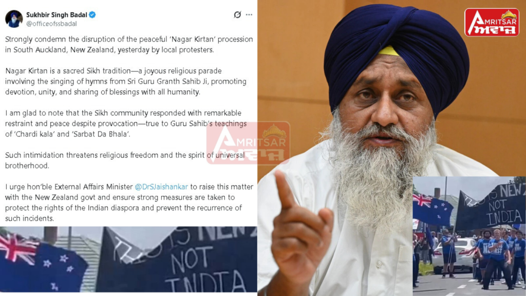 ਸ਼੍ਰੋਮਣੀ ਅਕਾਲੀ ਦਲ ਦੇ ਪ੍ਰਧਾਨ ਸ. ਸੁਖਬੀਰ ਸਿੰਘ ਬਾਦਲ ਨੇ ਨਿਊਜ਼ੀਲੈਂਡ ‘ਚ ਨਗਰ ਕੀਰਤਨ ਦਾ ਰਾਹ ਰੋਕਣ ਦੀ ਸਖ਼ਤ ਨਿੰਦਾ ਕੀਤੀ ਹੈ। ਉਨ੍ਹਾਂ ਕਿਹਾ ਕਿ ਨਗਰ ਕੀਰਤਨ ਇੱਕ ਪਵਿੱਤਰ ਸਿੱਖ ਪਰੰਪਰਾ ਹੈ। ਉਕਸਾਉਣ ਦੇ ਬਾਵਜੂਦ ਸਿੱਖ ਭਾਈਚਾਰੇ ਨੇ ਸ਼ਾਂਤੀ ਨਾਲ ਜਵਾਬ ਦਿੱਤਾ । ਅਜਿਹੀ ਧਮਕੀ ਧਾਰਮਿਕ ਆਜ਼ਾਦੀ ਤੇ ਭਾਈਚਾਰੇ ਦੀ ਭਾਵਨਾ ਲਈ ਖ਼ਤਰਾ ਹੈ। ਉਨ੍ਹਾਂ ਕਿਹਾ ਕਿ ਮੇਰੀ ਅਪੀਲ ਹੈ ਕਿ ਭਾਰਤ ਦੇ ਵਿਦੇਸ਼ ਮੰਤਰੀ ਇਸ ਮਾਮਲੇ ਨੂੰ ਨਿਊਜ਼ੀਲੈਂਡ ਸਰਕਾਰ ਦੇ ਸਾਹਮਣੇ ਚੁੱਕਣ ਤੇ ਨਾਲ ਹੀ ਉਨ੍ਹਾਂ ਕਿਹਾ ਕਿ ਭਾਰਤੀ ਪ੍ਰਵਾਸੀਆਂ ਦੇ ਅਧਿਕਾਰਾਂ ਦੀ ਰੱਖਿਆ ਲਈ ਸਖ਼ਤ ਉਪਾਅ ਕੀਤੇ ਜਾਣ ਅਤੇ ਅਜਿਹੀਆਂ ਘਟਨਾਵਾਂ ਦੇ ਮੁੜ ਵਾਪਰਨ ਨੂੰ ਰੋਕਣ ਲਈ ਸਖ਼ਤ ਕਦਮ ਚੁੱਕਣ।