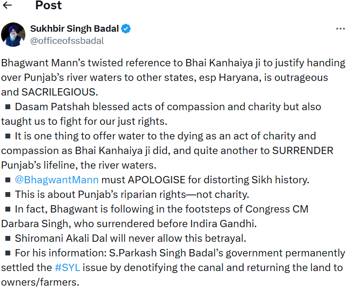Shiromani Akali Dal : ਅਕਾਲੀ ਦਲ ਦੇ ਪ੍ਰਧਾਨ ਨੇ ਭਗਵੰਤ ਮਾਨ ਵੱਲੋਂ ਸਾਜ਼ਿਸ਼ੀ ਤਰੀਕੇ ਨਾਲ ਭਾਈ ਕਨ੍ਹਈਆ ਜੀ ਦਾ ਇਤਿਹਾਸਿਕ ਹਵਾਲਾ ਦੇ ਕੇ ਪੰਜਾਬ ਦੇ ਦਰਿਆਈ ਪਾਣੀਆਂ ਨੂੰ ਹੋਰਨਾਂ ਰਾਜਾਂ, ਖ਼ਾਸ ਕਰਕੇ ਹਰਿਆਣਾ ਨੂੰ ਦੇਣ ਲਈ ਜਾਇਜ਼ ਠਹਿਰਾਉਣਾ ਨਿੰਦਣਯੋਗ ਅਤੇ ਇਤਿਹਾਸ ਦੀ ਬੇਅਦਬੀ ਕਰਾਰ ਦਿੱਤਾ ਹੈ।