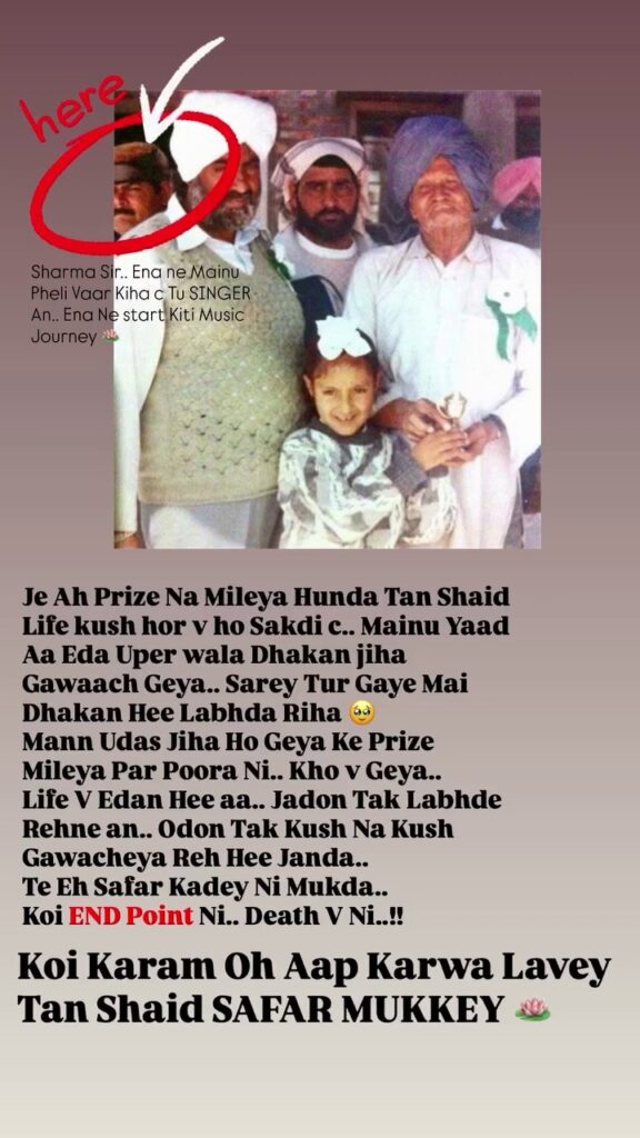 ਗਾਇਕ ਨੇ ਬਚਪਨ ‘ਚ ਇਨਾਮ ਲੈਂਦੇ ਹੋਏ ਦੀ ਇੱਕ ਤਸਵੀਰ ਸ਼ੇਅਰ ਕਰਕੇ ਲਿਖਿਆ ਕਿ “ਜੇ ਆਹ Prize ਨਾ ਮਿਲਿਆ ਹੁੰਦਾ ਤਾਂ ਸ਼ਾਇਦ ਜ਼ਿੰਦਗੀ ਕੱਝ ਹੋਰ ਵੀ ਹੋ ਸਕਦੀ ਸੀ, ਸ਼ਰਮਾ ਸਰ ਨੇ ਮੈਨੂੰ ਪਹਿਲੀ ਵਾਰ ਕਿਹਾ ਸੀ ਕਿ ਤੂੰ ਸਿੰਗਰ ਏ, ਇਨ੍ਹਾਂ ਨੇ ਹੀ ਮੇਰੀ ਮਿਊਜ਼ਿਕ Journey ਸ਼ੁਰੂ ਕੀਤੀ।”